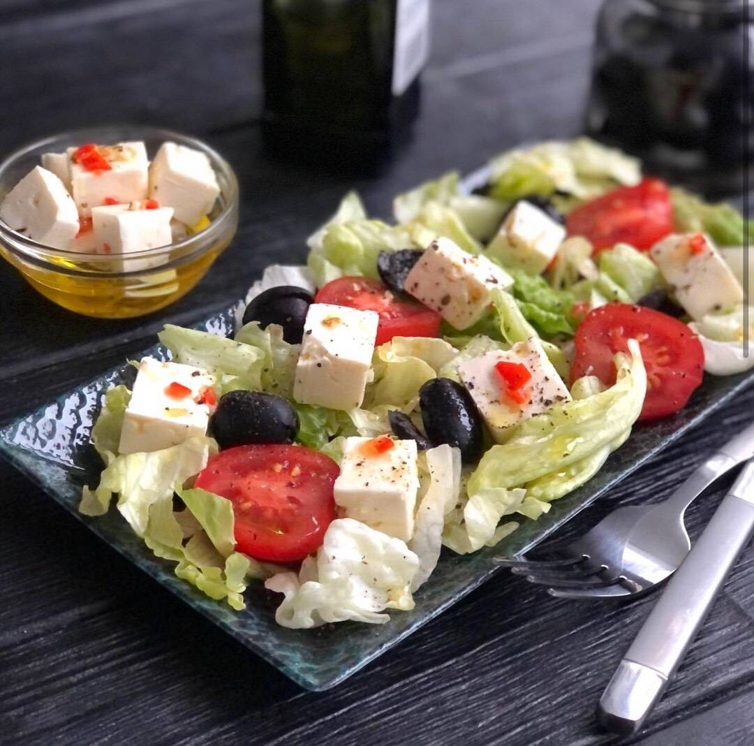 Ингредиенты: Для маринования сыра:, феты или брынзы, белого винного уксуса, сахара, оливкового масла, чеснока, красного чили (регулируйте по вкусу), итальянских трав, Для подачи:, салатная смесь (например, айсберг и романо), чёрные или зелёные оливки, помидоры черри, свежемолотый чёрный перец