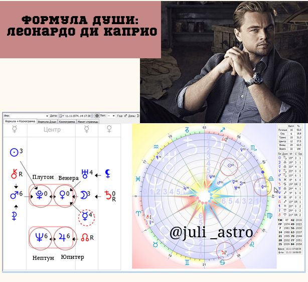 Ди Каприо получил имя Леонардо благодаря матери, так как он впервые задвигался у неё в животе, когда она смотрела картины Леонардо да Винчи. Родители восприняли это как знак и назвали его Леонардо. В ФД актёра стоит ретро Сатурн, что говорит о том, что отца могло не хватать в детстве. И, действительно, родители будущего актёра развелись, когда ему был год. Но поддержку отца, по его словам, он чувствовал всегда, и жил то с отцом, то с матерью. В 14 лет Леонардо уже знал, что будет актёром. Как известно, цикл Юпитера – 12 лет и, следовательно, человеку к 12-14 годам важно определиться с профессией, иначе будет потом долго себя искать по жизни. За актёрскую деятельность отвечает Венера-планета талантов, которая стоит у Леонардо в первом центре. Нептун и Юпитер, которые стоят во втором центре тоже отвечают за актёрскую деятельность. Меркурий на миницентре- про деятельность разговорного жанра. А Плутон даёт масштаб, глобальность в реализации. Солнце стоит на первой орб