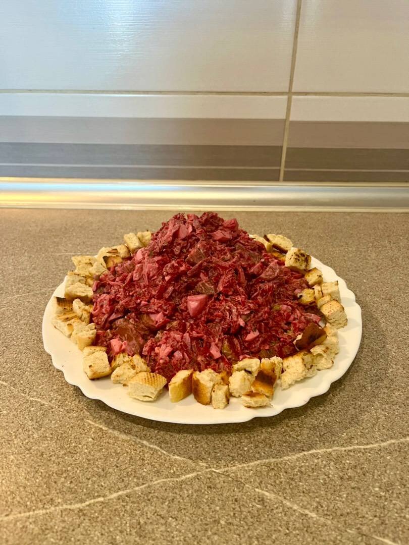 Ингредиенты: Свекла, Лук, Яйца, Солёные огурцы, Сметана, Соль, перец, укроп, Сухарики Способ приготовления: Вареную свеклу натереть на крупной терке, лук нарезать и обжарить, яйца сварить и порезать кубиками. Огурцы порезать также кубиками. Все ингредиенты смешать, добавить сметану, укроп, посолить, поперчить. Ещё раз хорошо перемешать. Делаем сухарики. Выкладываем на тарелку салат и по бокам раскладываем сухарики. ПРИЯТНОГО АППЕТИТА!!! Заходите на Инстаграм Viktoriianagaev