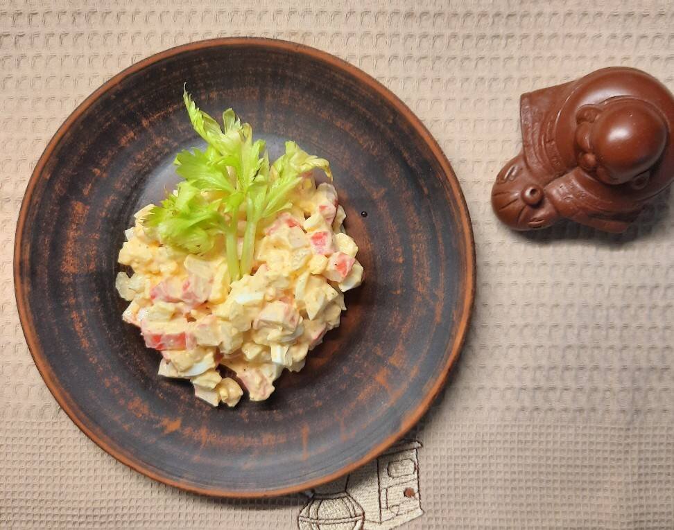#23февраля За отличную идею салата спасибо автору сайта @ella_na_kuhne Ингредиенты: яиц, крабовых палочек, сельдерея, Паприка молотая копченая, молотый черный перец , Майонез Способ приготовления: Крабовые палочки нарезать кубиками. Сельдерей мелко нарезать. Яйца отварить и нарезать кубиками. Нарезанные продукты сложить в салатник, добавить паприку, чёрный перец и заправить майонезом. Хорошо перемешать. Приятного аппетита. Если Вам понравился рецепт: буду рада увидеть Ваши фотоотзывы и комментарии.