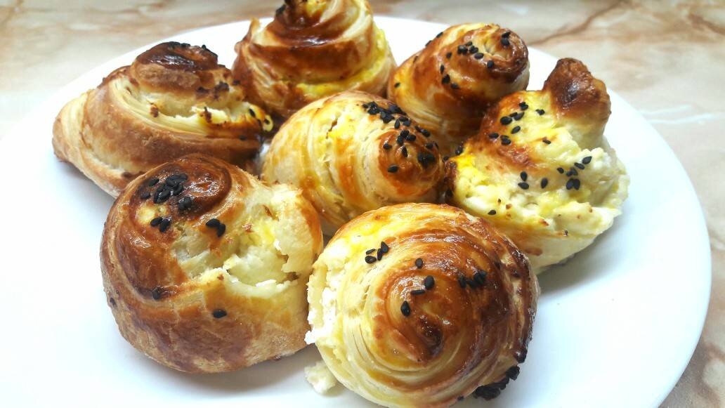 #меню Ингредиенты: слоеного теста, Мука на подпыл, Творог, сахарного песка, Яйцо для смазывания, Семена на посыпку-украшение Способ приготовления: Разморозить лист слоеного теста. Раскатать в одну сторону и разрезать на три полоски. Смешать творог с сахаром и распределить по полоске равномерно. Свернуть рулетиком. Разрезать по центру. Защипнуть срез и поставить на противень. Смазать яйцом и присыпать кунжутом. Выпекать при 200° 15-20 минут.