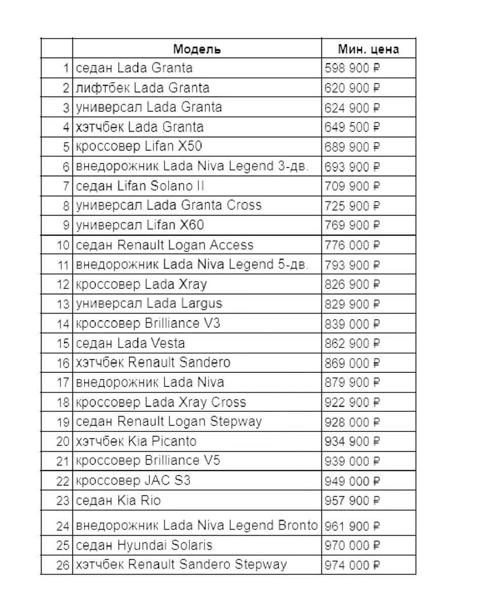 Мы составили список автомобилей, цена которых не превышает 1 000 000 рублей. Все цены указаны по состоянию на 20 января 2021 года. Стоимость каждого автомобиля взята с сайта официальных производителей. На первом месте среди новых дешевых автомобилей уже несколько лет подряд - Lada Granta седан. Её цена в этом году начинается от 598 900 рублей. Из иностранных моделей в первой десятке оказался автомобиль Lifan X50, но самый свежий новый автомобиль - только 2018 года выпуска. Возможно, для кого-то это не будет критично, но все же хочется автомобиль свежего года выпуска. На десятой позиции расположился седан Renault Logan по цене от 776 000 рублей. Также в рейтинг попали такие иностранные марки машин, как KIA, Hyundai, Brilliance и JAC. . Подробнее о ценах на авто в 2022 в таблице ниже. В новом году из списка машин до 1 000 000 рублей вылетели такие модели как: Renault Duster, Kia Rio X, Lada Vesta Cross, внедорожник УАЗ Хантер и седан Volkswagen Polo. Эти автомобили значительно подорож
