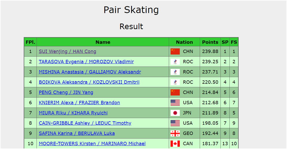 Китай делал главную ставку на парное катание, потому что это единственный вид, где страна могла взять золото. Суй/Хань вывели в общем зачете на третье место. Прокаты пар были сильными и мощными. Мы увидели практически безупречные прокаты от наших пар! Но все-таки заметно, что общий уровень парного катания в мире невысокий. Многие прыгают простые каскады, которые делают даже юниоры в России. Я надеюсь, что после Олимпийских Игр технический контент пар повысится. Обсудим топ-4 лучших пар по результатам соревнования