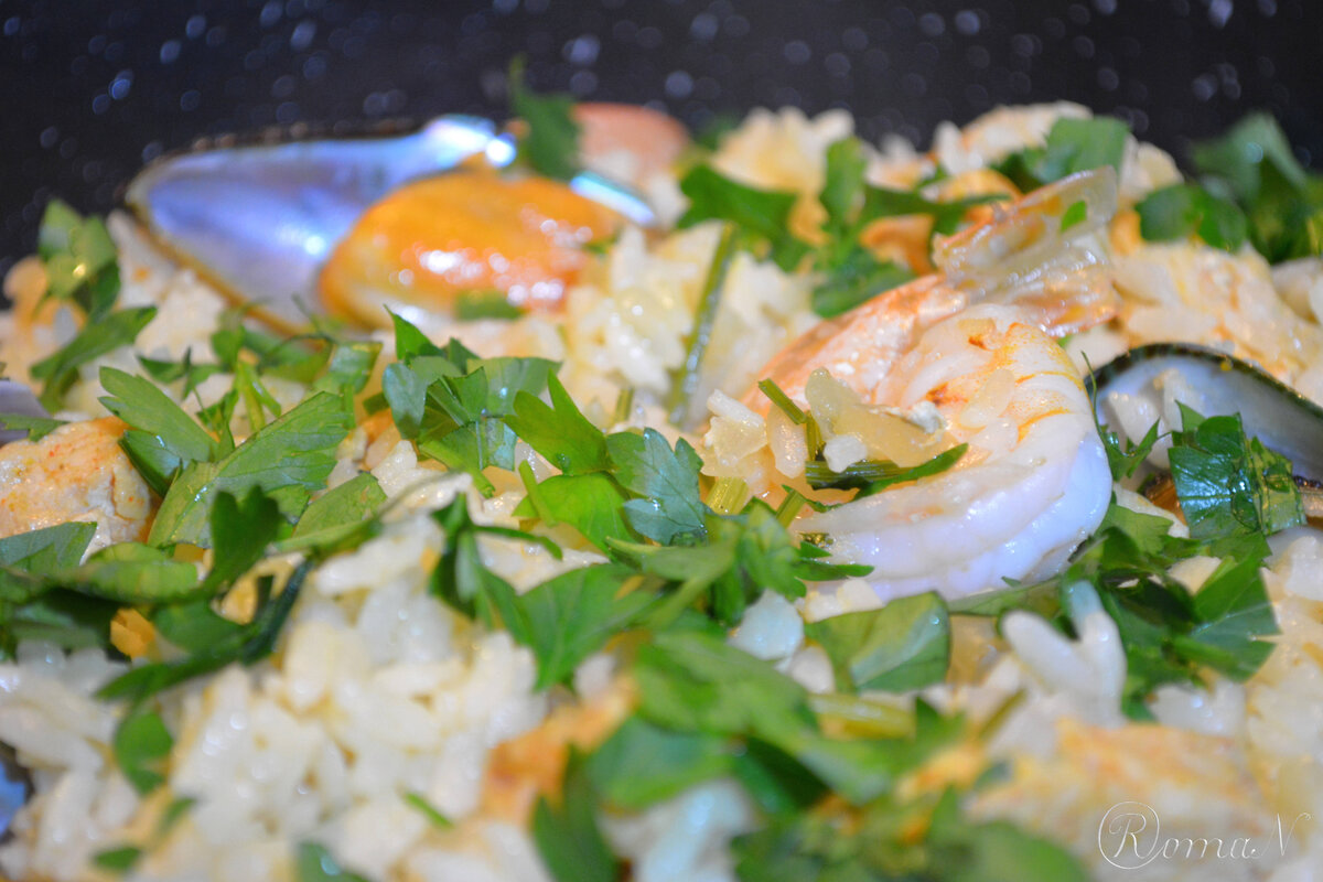 Эта паэлья отличается от других тем, что содержит диетические продукты, приготовленные щадящим методом. Ингредиенты: круглого риса, куриной грудки, сырых креветок, мидий в раковине, мидий очищенных замороженных (или микса морепродуктов), репчатая луковица, петрушки, чеснока, куркума, сладкой паприки, шафрана, соль Способ приготовления: У меня все морепродукты замороженные, поэтому в первую очередь их надо разморозить естественным способом. Оттаявшую жидкость не выливать. Куриную грудку нарезать на кусочки-полосочки. Посолить, добавить куркуму и сладкую паприку, перемешать, оставить на 30 минут. Половинку луковицы мелко нарезать и обжарить до прозрачности в небольшом количестве оливко-растительного масла. Добавить к луку грудку, перемешать, довести до белого цвета, влить 1 стакан кипятка, дать закипеть и потомить под крышкой на средне-маленьком огне 15-20 минут. Выложить мясо на тарелку, отцедив жидкость в стакан, долив стакан до полности кипятком. Одновременно отцедить от оттаявших мор