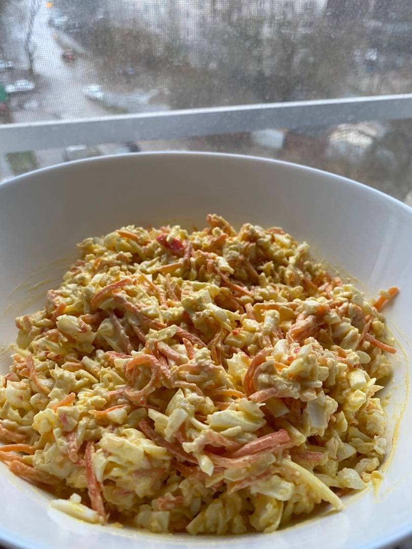 Стоимость салата : 3 яйца - 21 р (10 шт - 69 р) , морковь по-корейски - 30 р (380 гр - 60 р), крабовые палочки - 50 р (200 гр - 90 р), плавленые сырки - 30 р Ингредиенты: варёных яйца, плавленых сырка «Дружба», крабовых палочек, моркови по-корейски, майонеза Способ приготовления: На крупной тёрке натираем яйца, крабовые палочки и плавленые сырки. Морковь по-корейски не добавляйте сразу, а дайте жидкости немного стечь. Иначе салат может превратиться в суп. Добавляем майонез и хорошо перемешиваем. По желанию, салат можно отправить в холодильник настояться. Всем приятного аппетита!