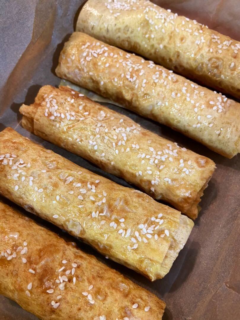 Ингредиенты: Лаваш армянский, Сыр, Сосиски, Яйцо, Кунжут Способ приготовления: Лаваш нарежьте полосками, как длина сосиски. Сосиски кладём на сыр, лаваш, заворачиваем. Обмакиваем в яйце и посыпаемся кунжутом. На предварительно разогретую духовку на 180 градусов на 20 мин. Приятного аппетита!☺️