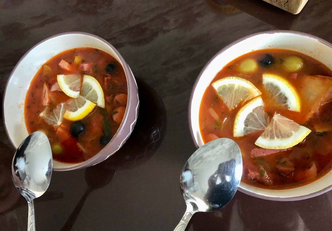 Очумительный рецепт солянки, морока только нарезать, остальное само станет вкусным супом. 😉😀 #солянка #суп Ингредиенты: колбаса обязательно варёно-копчена, рёбра копченые свиные, ветчина в/к, колбаски охотничьи (копченые), маслин, оливки, лук 🧅, томатной пасты, огурец соленый средний, сливочного масла, соль, сахар, перец чёрный молотый, укроп и петрушка, лимон Способ приготовления: Колбасу, ветчину нарезаем полосками. Колбаски кольцами. Рёбра по рёбрам. Огурец треугольниками. Огурец сразу кладём в кастрюльку, добавляем воды чтобы покрывала огурец и сливочное масло, на средний огонь вариться. А колбасные изделия отправляем на сковороду без масла. Обжариваем минут 7 мясцо наше, выкладываем его в тарелку и на сковороду с уже выжаренным маслом и немного смешанным с подсолнечным маслом оправляем нарезанный перьями (полукольцами) лук. Минуты 3-5 обжариваем на сильном огне лук, добавляем томатную пасту, сахар, перец молотый, немного соли, на всякий случай) 2 минуты обжариваем и добавляем 2