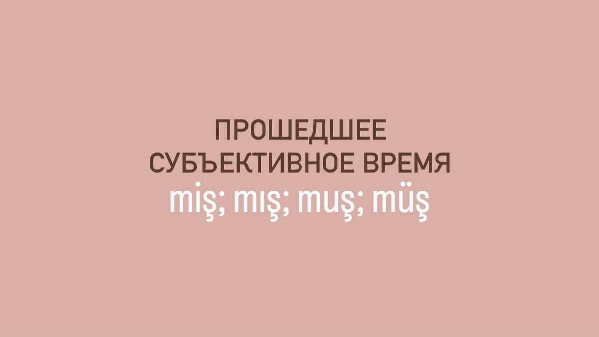 ПРОШЕДШЕЕ СУБЪЕКТИВНОЕ ВРЕМЯ МЫШ (mış) МИШ (miş) МУШ (muş) МЮШ (müş) В ТУРЕЦКОМ ЯЗЫКЕ Это время поможет вам рассказать о событиях, которые происходили не с вами, соответсвенно варианты склонения по местоимениям Я и МЫ исключаются. И нужно пользоваться логикой, чтобы склонять с местоимениями ВЫ и ТЫ, потомучто не во всех случаях это время можно применять к этим местоимениям, поэтому лучше и к ним не применять это время. Чаще всего его применяют к местоимениям: ОНИ, ОН, ОНА, ОНО. Например, если вы готовите еду и хотите спросить чужое мнение, то спрашиваете готово? OLDU MU? Но если вы ждете когда кто-то приготовит вам еду и забегаете на кухню с вопросом к повару: «готово?» OLMUŞ MU? При этом обратите внимание и в первом и во втором случае мы разговариваем с человеком о еде, как о третьем лице. Вы можете спросить у своих коллег, пришел ли ваш начальник: patron gelmiş mi? Или пересказать историю о которой рассказал вам брат о своем друге, все действия которые сделал друг будут субъективным