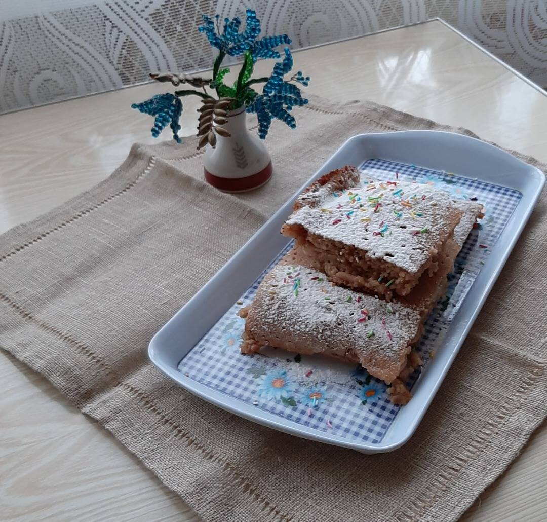 #выпечка #манник #пирог #кчаю Этот манник готовится без яиц. Невероятный аромат придают бананы и манник получается нежнейшим, обязательно попробуйте приготовить! Ингредиенты: кефира, манки, сахара, банана, разрыхлителя, ванилин, корица, Для украшения, сахарная пудра, цветная кондитерская посыпка Способ приготовления: Манку смешать с сахаром, постепенно вливая кефир. Всыпать разрыхлитель, ванилин, корицу. Тщательно перемешать. Половину теста вылить в стеклянную форму, смазанную растительным маслом. Выложить нарезанные тонкими кружочками бананы. Залить оставшимся тестом и поставить в разогретую до 180 градусов духовку на 1 час. Остывший пирог украсить просеянной сахарной пудрой и кондитерской посыпкой.