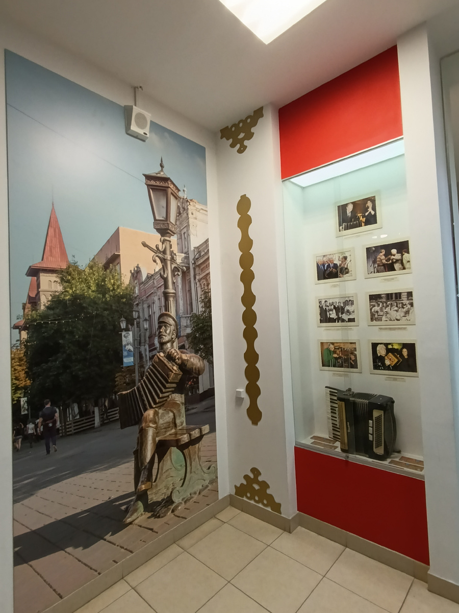 Одним из символов Саратова является музыкальный инструмент - гармонь! И единственный в Саратове музыкальный музей посвящен именно этому инструменту. Расположен он на углу улицы Горького и ул. Мичурина. При входе сразу фото скульптуры саратовского гармониста на пр. Столыпина. Дальше по коридору к небольшой комнате с основной экспозицией. Коридоры продолжаются дальше. Музей расположен в учебном заведении. Входим в зал музея. В экспозиции инструменты, фото, книги, сувениры. На одном из стендов все виды гармоней и их "родственников". Наш инструмент, это не просто абстрактная гармонь, а именно саратовская, с особенным устройством. Главным отличием от других видов является наличие колокольчиков. Сбоку. Похожи на звонок в школе. Кстати, для начала важно сказать. Что гармонь не в коем случае не «народный» инструмент! В том смысле, что ее история не уходит в глубь веков)) И тем более в России. По распространенному мнению ее изобрели в начале 19 века в Германии. Как вы увидите ниже, конструкция