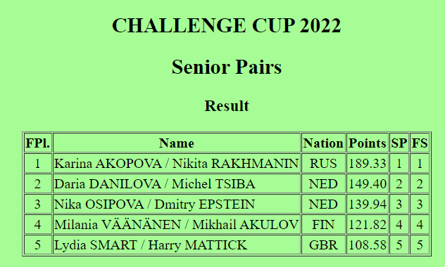 Итак, всем кто решил прочитать эту статью рассказываю. Речь идёт о небольшом турнире CHALLENGE CUP 2022, который проходит под эгидой ИСУ и соответственно позволяет набрать минимальный технический уровень для участия в чемпионате мира. Турнир проходит в Нидерландах в категориях "взрослые", "юниоры" и "новисы". Большинство участников - фигуристы из Европы, не обладающее какими-то серьёзными достижениями в карьере. Россию на этом турнире представляют лишь два фигуриста, а точнее говоря одна спортивная пара - Карина Акопова/Никита Рахманин. Наши фигуристы выступали по взрослым. Участников в этом виде было не много, всего четыре пары не считая россиян. Карина и Никита не избежали небольших помарок и в короткой и в произвольной программах, но всё равно выиграли этот турнир с большим преимуществом.