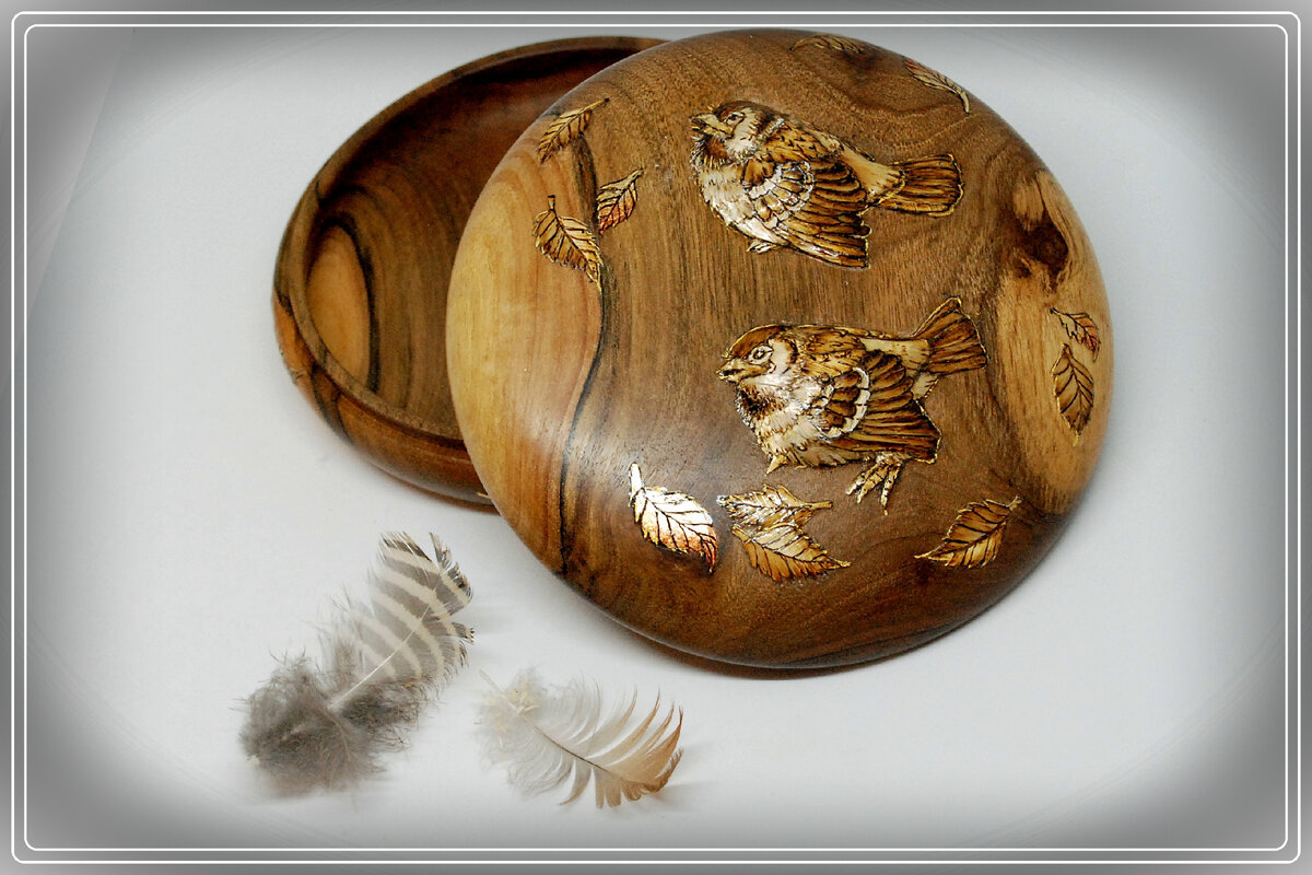 Круглых шкатулок из грецкого ореха у меня две - одну теперь украшают мальчишки воробьи, на второй будет не менее эффектная рысь. Но о ней я расскажу в дальнейших публикациях