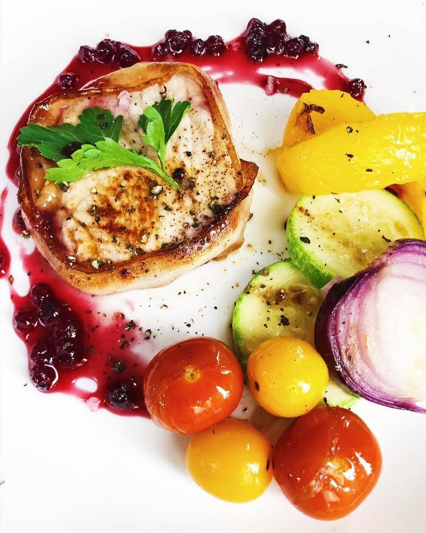 Медальоны из свинины в беконе, овощами гриль и брусничным соусом