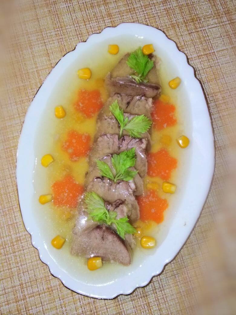 Очищенный язык порезать тонкими слайсами, морковь по желанию вырезать фигурно. Желатин растворить в теплом бульоне, размешать до полного растворения. На блюдо налить немного бульона, дать застыть. Затем выложить слайсы языка, морковь. По желанию можно добавить зелень, консервированный горошек или кукурузу. Влить немного бульона, чтобы всё схватилось, убрать в холодильник. Затем влить оставшийся бульон и снова убрать застывать.