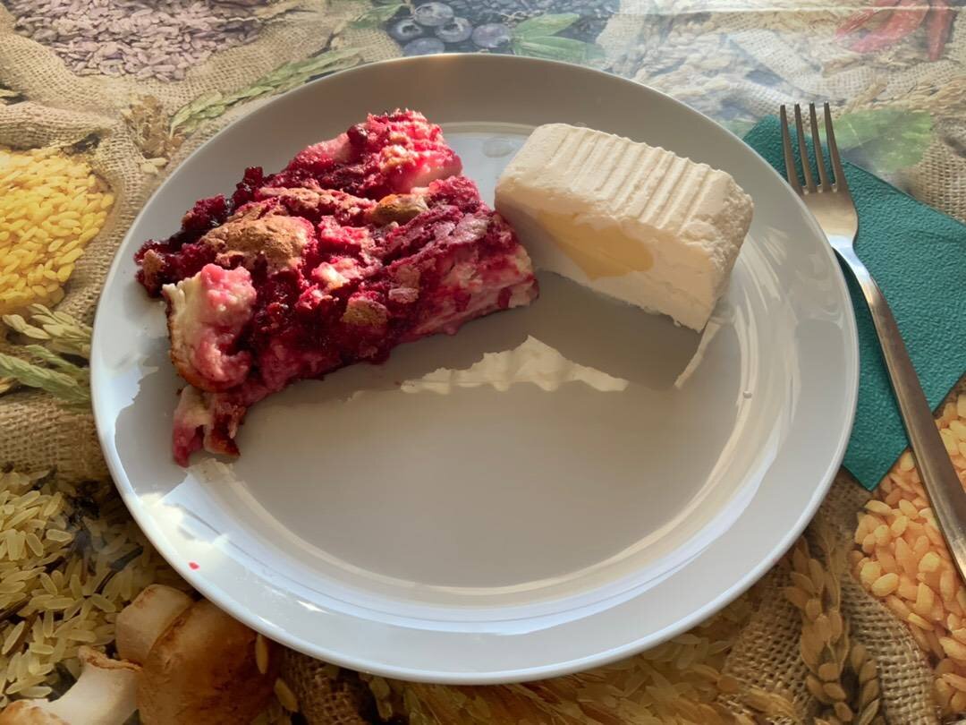#меню Ингредиенты: Творожный слой:, творога 9% жирности, яйца, муки, сахарного песка, ванильного сахара, молока, соли, Клюквенный слой:, мороженной клюквы, сахарного песка, яйцо, постное масло без запаха, манка для смазывания противня, На подачу - мороженое (у меня - пломбир манго-маракуя) Способ приготовления: Отделяем белки от желтков. Белки взбиваем миксером со щепоткой соли, 50 гр сахарного песка и ванильным сахаром до твёрдых пиков. Размораживаем клюкву. Пробиваем через блендер с сахарным песком и 1 желтком. Взбиваем творог с мукой, молоком, 50 гр сахарного песка и желтками. Аккуратно вмешиваем взбитые белки в обе смеси. Смазываем постным маслом противень, посыпаем манкой. Выливаем творожный слой, затем клюквенный и в духовку при 190 гр на 35-40 мин. Смотрите по вашей духовке. Вуаля! Подаём тёплым с мороженым)).