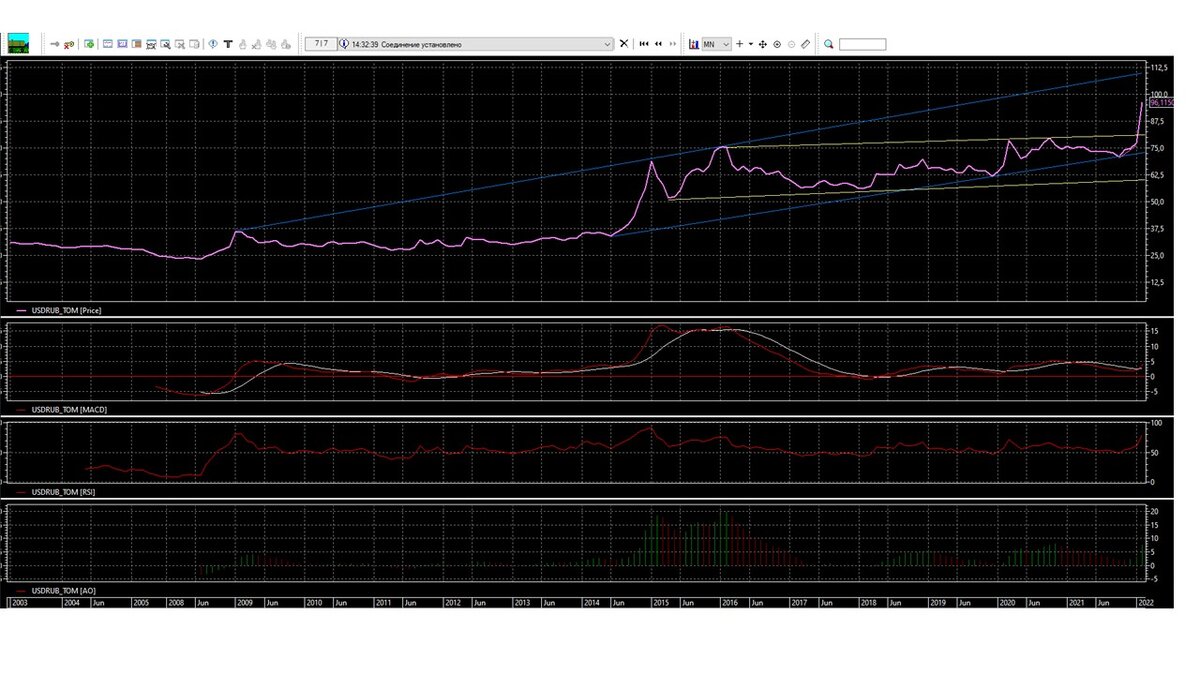 Новая неделя для валютной пары доллар/рубль и евро/рубль будут тяжелыми, новая волна санкций и большая запутанность. Вызывает новую волну паники на валютном рынке, а с уровень рынка могут вернуться по доллару/рубль на уровень 80 или выше, евро/рубль на уровень 90 и выше. Будем надеяться Центральный банк РФ, вероятно готов к такой ситуации, может получиться и обратная картина. Хотя технический анализ показывает такую картину, с открытием рынка валютная пара может скатиться доллар/рубль на уровень 79-80. В крайнем случае зайдут в коридор 75-78, но думаю туда не дойдем, скорее всего будут разворачивать на уровне 78-79. Если до среды удержимся выше уровня 78-79, появляется возможность закрыть неделю в коридоре 80-83 или выше. К среде окажемся в коридоре 75-78, тогда все будет решаться в пятницу, ближе к линии поддержке, вероятно, тогда готовимся проверки прочности линии поддержки. Застрянем в середине коридора, вероятно будет боковик, рядом с линией сопротивления, будем пробовать прочност