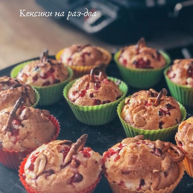 2. Разложить по формам, сверху присыпать ягодами, орешками и воткнуть кренделек. Выпекать в заранее разогретой духовке при 180°С 40 минут.