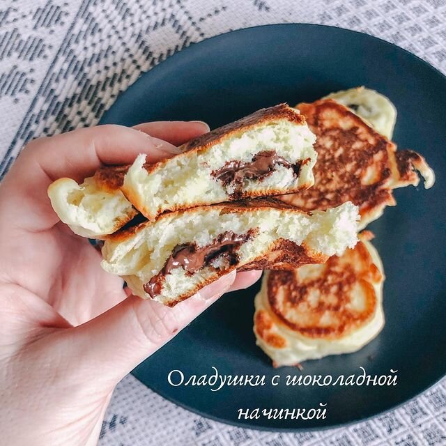 Для тех, кто пышные оладьи уже печь умеет — следующий уровень: оладьи с шоколадной начинкой.