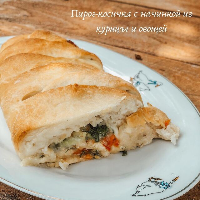 4. Тесто делим на две части. Одна часть — один пирог. Стол присыпаем мукой и раскатываем тесто. Режем по краям, выкладываем начинку и заплетаем косичку (см. фото в карусели). К