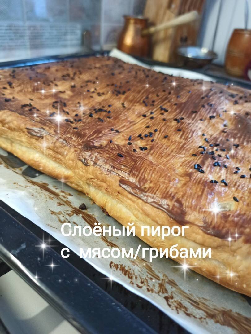 Очень вкусный, сытный и сочный пирог получился. Съели весь сразу, даже фото в разрезе сделать не успела. #23февраля 🎉🎉🎉🎉 Ингредиенты: слоёного теста, фарша мясного, луковицы, брутто шампиньоны замороженные, на выходе будет 250 гр. нетто, сухого риса, соль + перец, растит. масло для жарки, кунжут чёрный Способ приготовления: Начала жарим грибы (у меня замороженные) до полного испарения жидкости. Добавляем нарезанный лук, солим, перчим. Доводим до готовности. В др. сковороде жарим фарш с луком. Припускаем рис в сотейнике. Смешиваем все фарши вместе. Раскатываем два пласта теста. Кладём начинку и закрываем сверху тестом. Хорошо защипываем края. Смазываем взбитым яйцом или сметаной. Сверху можно посыпать кунжутом. Выпекаем при Т-180*С минут 25-30. Тесто хорошо зарумянится и увеличится в объёме. Благодарю всех, кто меня поддерживает!🤗🤗🤗😍😍😍 Если Вам понравился рецепт - поставьте Класс, поделитесь в соцсетях, напишите комментарий или отправьте фото отзыв. Ваши отзывы - самая лучшая
