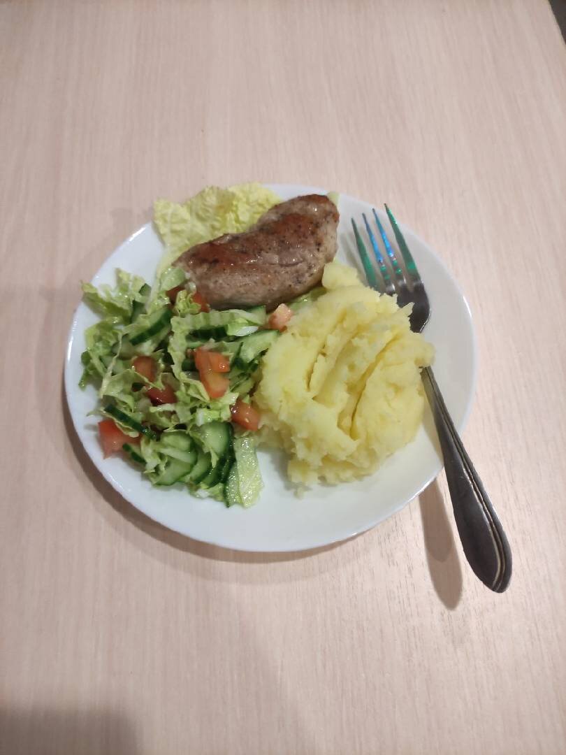 Ингредиенты: Свиные стейки, Картошка, Огурец, Помидор, Пекинский салат, Семена кунжута, Соль, Перец, Сливочное масло Способ приготовления: Перед тем как варить картошку ее нужно почистить и нарезать кружочками примерно по 5 мм, чтобы было удобнее толочь пюре. Воду нужно посолить, хватит половины столовой ложки соли и добавить в воду столовую ложку растительного масла. Пока варится картошка, ставим на плиту сковороду со стейками. Стейки предварительно посыпаем солью, красным и чёрным перцем, руками втираем все специи в мясо. Жарим на масле по 7 минут с каждой стороны под крышкой. Пока жарятся стейки, делаем пюре. Воду из под картошки сливаем в банку или кружку. Добавляем к картошке столовую ложку сливочного масла, щепотку соли и треть чайной ложки сахара (так вкус станет мягче). Мнем картошку, при необходимости подливаем воду, в которой она вариалсь. Когда не осталось комочков, нужно попробовать на соль. Отставляем пюре в сторону, даем отдохнуть. Нарезаем салат. Мелким кубиком режем огу