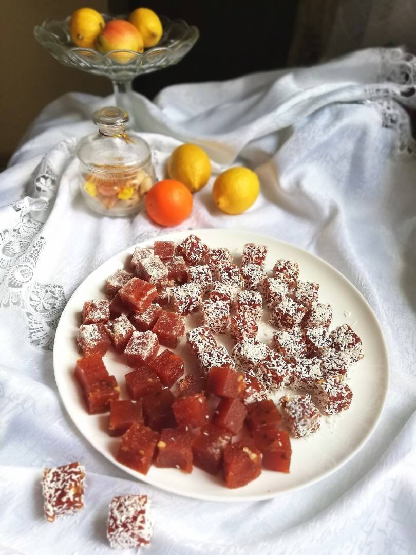 Айва это твёрдый фрукт, напоминающий нечто среднее между яблоком и грушей. Большинство сортов нельзя есть сырыми и требуют специального приготовления. Айва идеально подходит для создания мармелада или густого повидла, ведь в этом фрукте так много пектиновых веществ, что не требуется дополнительно добавлять ни желатин, ни агар - агар. Ингредиенты: айва очищенная, сахар, мед, воды, корицы, молотой гвоздики, орехи (у меня грецкие, можно миндаль очищенный), сок и цедра 1-го лимона Способ приготовления: Айву хорошо моем, очищаем от сердцевины и кожуры. Очистки не выбрасываем! Складываем всё в марлю. В кожуре и сердцевине больше всего пектина. Кладём дольки айвы в воду (1 стакан) с соком лимона, чтобы они не потемнели и для кислинки в готовом мармеладе. Помещаем туда же сразу завязанную в узелок марлю с очистками. Кастрюлю ставим на средний огонь и варим около 30 минут до мягкости айвы. Оставляем айву немного остыть и измельчаем в блендере. Узелок с очистками вынимаем, даём ему остыть и отжи