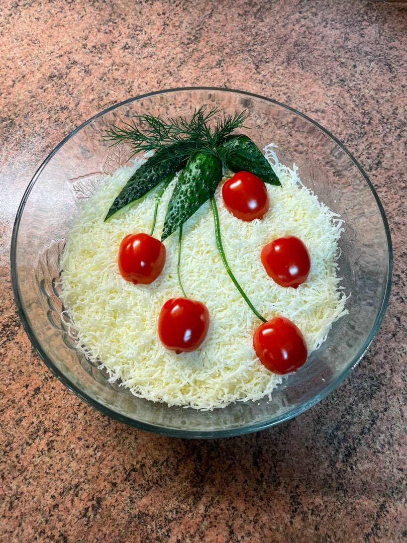 По рецепту #23февраля # Санкт-Петербург Ингредиенты: отварного картофеля, шпрот, майонез, куриных яйца, сыра, зеленого лука, томаты Черри, огурцы, укроп для украшения Способ приготовления: Яйца отварить вкрутую, остудить, очистить. Картофель отварить в мундире, остудить, очистить от кожуры. На дно салатника выложить майонез, сверху натереть на крупной терке картофель, смазать майонезом. Из банки со шпротами слить масло, на отдельной тарелке вилкой размять шпроты, выложить шпроты на слой картофеля. Зеленый лук помыть, обсушить бумажным полотенцем, нарезать. Выложить на шпроты. Яйца натереть на крупной терке и выложить на лук, смазать майонезом. Сверху натереть сыр на мелкой терке, украсить овощами и зеленью. Дать пропитаться в холодильнике несколько часов. Приятного аппетита 🍽.