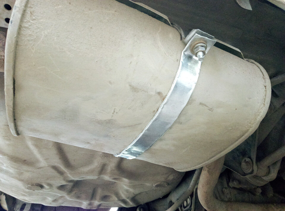 В первую очередь демонтируют кронштейн закрепления глушителя и изношенный подвес. С двух сторон кронштейна просверливают отверстия в тех местах, где был установлен подвес. Далее отрезают часть ремня и делают в нем отверстия, концы изделия прикручивают болтами к кронштейну. Такое крепление глушителя позволит сэкономить средства на покупке новых элементов фиксации. Некоторые умельцы используют цанговое соединение для зажима скоб.