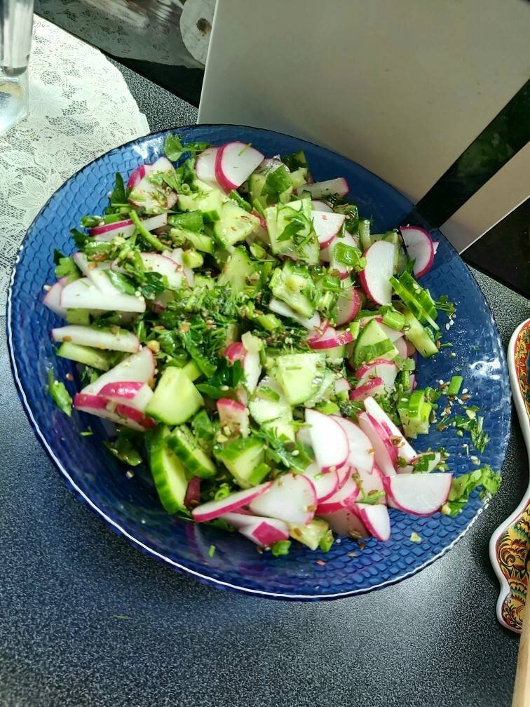 Ингредиенты: редиса, крупный огурец, зелени (лук, петрушка, укроп), салатной смеси из орехов и семечек, соль, специи, подсолнечное и оливковое масло