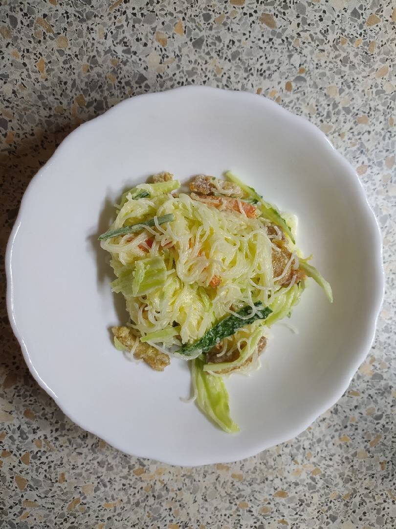 #23февраля Ингредиенты: Фунчоза, Огурец, Курица, Морковка, Лук Способ приготовления: Свинину нарезать брусочками, обвалять в крахмале, обжарить. Морковку, лук нарезаем пассеруем. В кипящую воду опустить сухую фунчозу, и до готовности. Выложить на дуршлаг. Остудить. Огурец нарезать. Соединить всё ингредиенты. Заправить майонезом. Bon Appetit
