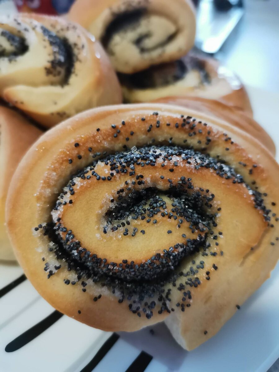 Очень простое, но в тоже время аппетитное, ароматное блюдо. Продукты для его приготовления нужны самые простые, суеты с приготовлением тоже минимум. Итак, нам понадобится: мука 480 гр масло растительное 50 гр яйцо 1 шт соль 1 ч.л. сахар 1ст.л. дрожжи сухие 1,5 ч л. молоко 240 мл мак кондитерский 50 гр сахар на посыпку 50 гр растительное масло 1 ст.л для смазывания булочек Итак, приступим. Если вас пугает дрожжевое тесто, то можете купить готовое. Я делаю его в хлебопечке, засыпаю все продукты и оно готово. Рецепт теста здесь. По аналогии с этим рецептом тесто можно, конечно, замесить и вручную. Далее мы раскатываем наше дрожжевое тесто скалкой на столе, припудренном мукой в виде такого прямоугольника. Не стоит раскатывать слишком тонко, высота теста должна быть 0,3-0,5 см. Теперь мы выливаем около 1 ст. л. растительного рафинированного масла на поверхность теста, кистью распределяем масло по поверхности, затем обильно посыпаем сахаром. Следующий шаг- также обильно сыпем мак. Теперь