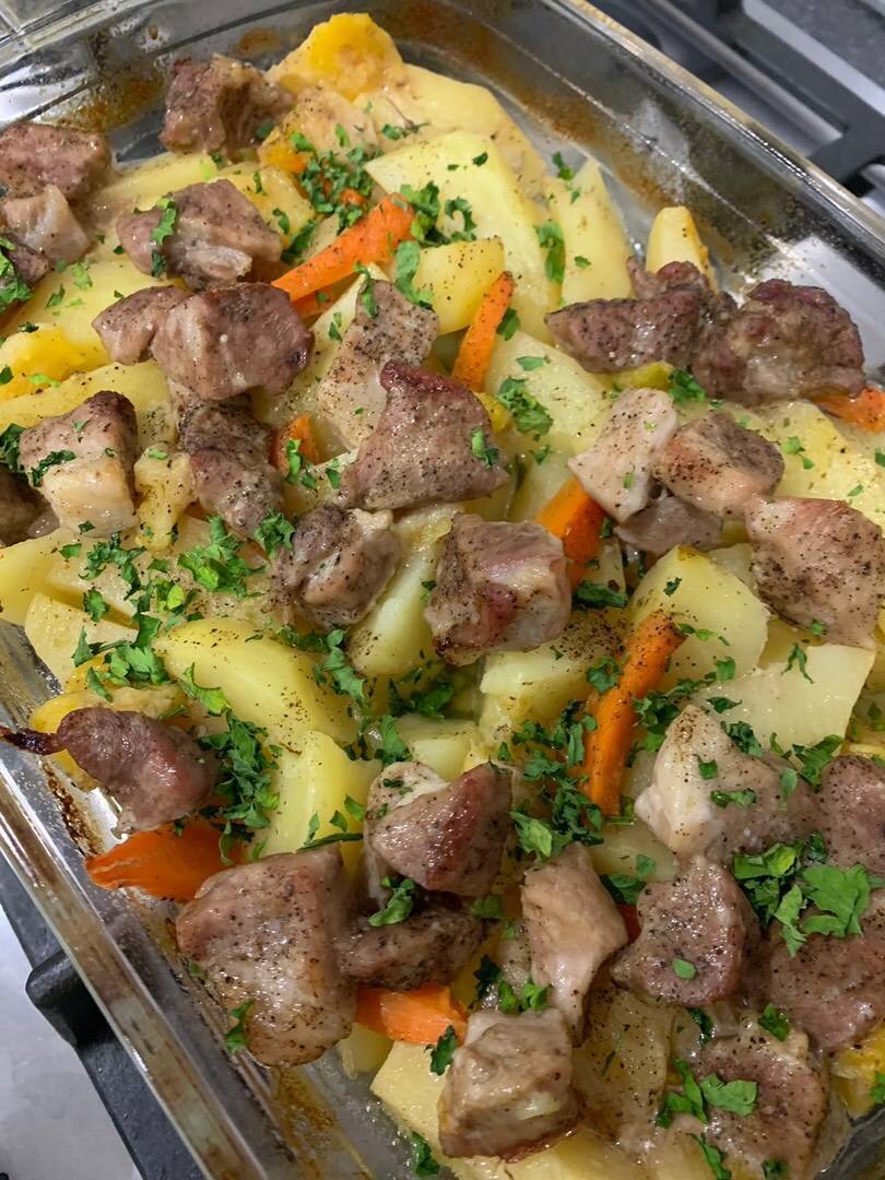 Блюдо получается нежным и сочным! Ингредиенты: мясо свиное, картофеля, морковь большая, тыквы, лук, масло растительное, специи , зелень Способ приготовления: Мясо моем, нарезаем кубиками крупно, картофель и морковь дольками тоже крупно, лук мелко, тыкву кубиками. Картофель перемешать с приправой Магги на второе. На противень кладём поочередно овощи, сверху мясо, специи, поливаем растительным маслом, покрываем фольгой и ставим в разогретую духовку до 200 градусов на 55-60 минут. Готовое блюдо посыпаем зеленью. Быстро и вкусно! Приятного аппетита!