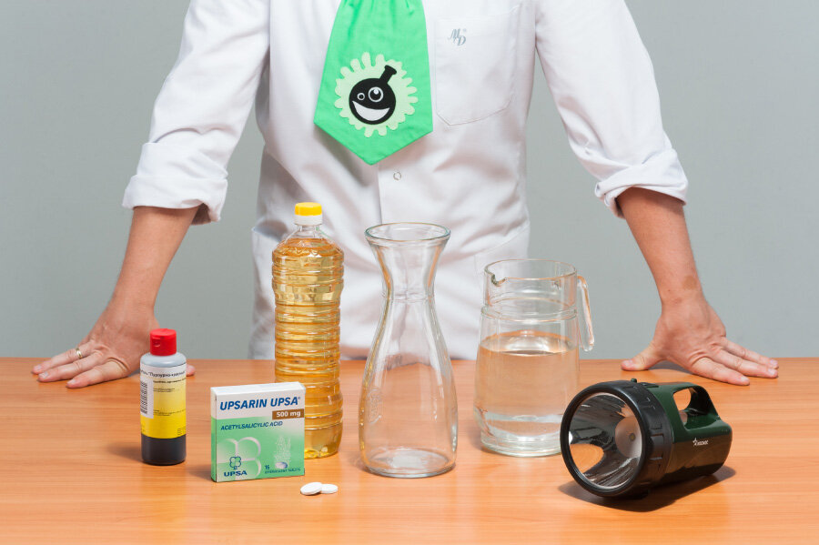 Лавовая лампа Как же можно приготовит лавовую лампу самостоятельно? Итак нам потребуются: - литровая пустая пластиковая бутылка; - растительное масло; - пищевые красители; - шипучие таблетки; - фонарик (необязательно, но красиво); Ход эксперимента: - наполним пустую бутылку растительным маслом так, чтобы осталось где-то два сантиметра до горлышка - остальное пространство заполним теплой водой - добавим внутрь 4-5 капель жидкого красителя - теперь самое время бросить внутрь 2-3 шипучие таблетки - наслаждаемся процессом, а теперь можно выключить свет и подсветить снизу фонариком – очень красиво! Почему же так происходит? Первая лавовая лампа была изобретена в Англии в 1965 году – в ней использовалась смесь воды и парафина (жидкого воска). При нагревании плотность воска меняется, что заставляет его подниматься вверх, далее он охлаждается, становится тяжелее и опускается вниз. Наша самодельная лавовая лампа также основана на различии плотности, только на это раз не парафина, а воды и масла