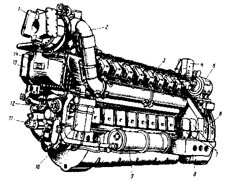 1 - турбокомпрессор; 2 - выпускной коллектор; 3 - крышка клапанного механизма; 4 - регулятор частоты вращения; 5 - возбудитель; 6 - тяговый генератор; 7 - центробежные очистители масла; 8 - поддизельиая рама; 9 - теплообменник; 10 - фильтры грубой очистки масла; 11 - масляный насос; 12 - водяные насосы; 13 - маслоотделительный бачок; 14 - охладитель воздухалей (до 90%) дизель 2А-5Д49 имеет со сборочными единицами и деталями дизеля 1А-5Д49 мощностью 2250 кВт. Повышение мощности дизеля до 2940 кВт достигнуто за счет увеличения давления наддувочного воздуха с 0,14 до 0,186 МПа, а также за счет более качественного воздухо-снабжения и параметров рабочего процесса. Дизель 2А-5Д49 (рис. 43) 16-цилнндровый, имеет У-образное расположение цилиндров. Дизель вместе с тяговым генератором монтируется на общей поддизельной раме 8, образуя дизель-генераторную установку 2А-9ДГ.