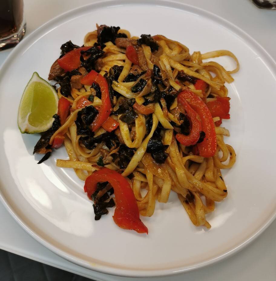 Ингредиенты: Удон, Индейка, Грибы муэр (брала на озоне) , Чеснок, Перец Чили по желанию, Имбирь, Лук, Красный перец, Зелёный лук, Раст масло, Устричный соус , Соевый соус, Тростниковый сахар, Перец чёрный Способ приготовления: Маринуем индейку в соевом соусе пока готовим соус для обжарки, заливаем индейку в соевый. Соус - в указанных пропорциях смешиваем устричный соус, соевый, сахар и перец. Грибы сухие заливаем водой на 15мин и нарезать их тонкой соломкой. В воке жарим чеснок с чили. Добавляем индейку, после исчезновения розовых прожилок добавляем грибы. Добавляем соус для обжаривания, перец, имбирь, лук и готовим до готовности индейки и перца. Готовый удон добавляем в вок, все перемешиваем и добавляем зелёный лук.