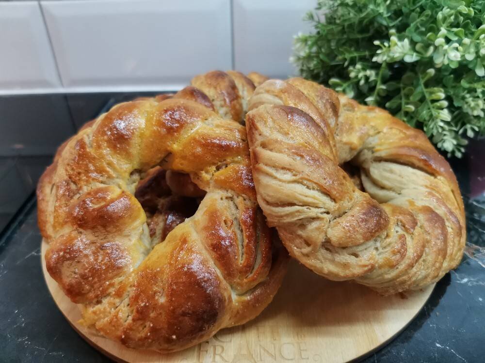 Ингредиенты: Для теста:, муки, сахара, вода тёплая, дрожжи сухие, ванилина, соль, растительного масла, Начинка, масло сливочное или растительное, корица, сахар, желток для смазывания булочек Способ приготовления: В глубокую миску добавить 2 -3 ложки муки, сухие дрожжи, 1 ложку сахара. Перемешать и вливаем теплую воду, продолжая мешать. Оставить на минут 10 для активации дрожжей. Затем добавляем оставшийся сахар, соль, ванилин и растительное масло. Тщательно перемешиваем, добавляем муку, замешивая тесто. Оставляем тесто на 1 час в тёплом месте. Готовое тесто достаём и немного обминаем. Выкладываем на стол с мукой. Хорошо помять и раскатываем в прямоугольник, толщиной 4-7 мм. Для начинки смешиваем примерно две столовые ложки сахара и 1 чайную ложку корицы. Тесто смазываем сливочным маслом комнатной температуры или растительным маслом. Затем посыпаем поверхность смесью из корицы с сахаром. Скручиваем рулет, разрезаем вдоль и скручиваем жгутик. Сворачиваем калач. Смазать желтком. Выпекаем