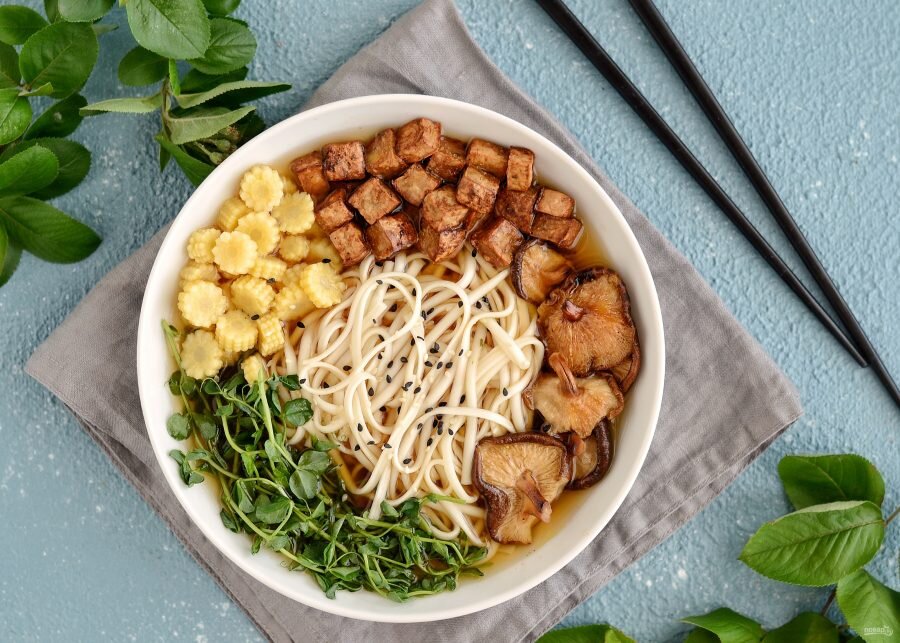 Что нам понадобится: 1. Растительное масло - 2 ст.л. 2. Грибы - 350 г. 3. Луковица - 1 шт. 4. Чеснок - 2 зубчика 5. Имбирь (тертый) - 1,5 ч.л. 6. Вода - 5 чашек 7. Бадьян - 1 коробочка 8. Тофу - 220 г. 9. Лапша - 90 г. 10. Паста чили/острый соус - 2-4 ч.л. 11. Паста миро - 2 ст.л. 12. Кунжутное масло - 1 ч.л. Приготовление: 1. Разогреть 1 ст.л. масла в кастрюле. Добавить грибы и готовить 10 мин. Как только подрумянятся, добавить лук и готовить еще 5 мин. до его мягкости и полупрозрачности. Добавить чеснок и имбирь, тушить минуту, пока аромат не раскроется. 2. Налить в кастрюлю воду, добавить бадьян. Довести до кипения, снизить пламя и варить минут 15 до мягкости грибов. 3. Пока суп варится, разогреть оставшееся масло в сковороде и обжарить тофу до румяной корочки. Переложить на бумажное полотенце. 4. Приготовить лапшу по инструкции на упаковке, откинуть на дуршлаг. 5. Как только суп перестанет кипеть, снять с огня и добавить чили пасту, мисо и кунжут. масло. Приправить по в