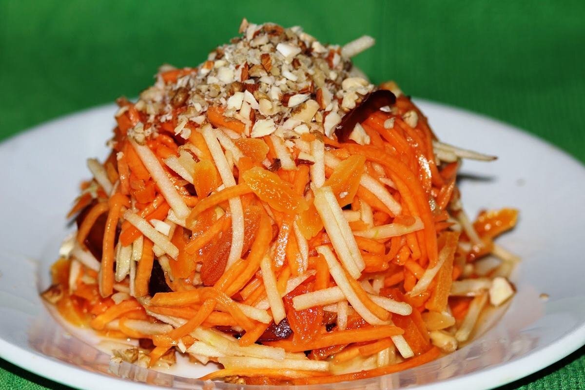 Что нам понадобится: 1. Тыква - 600 г 2. Яблоки - 4-5 шт. 3. Лимон - 1 шт. 4. Мед - 1 ст. л. 5. Орехи грецкие молотые - 3 ст. л. 6. Морковь - 1-2 шт. 7. Зелень по вкусу Приготовление: 1. Грецкие орехи почистить. 2. Тыкву и морковь очистить и помыть. Морковь нарезать соломкой. А тыкву натереть на крупной терке. 3. Лимонный сок отжать в отдельную емкость. 4. С лимона срезать цедру и нашинковать ее соломкой. 5. Яблоки очистить и нарезать соломкой. 6. Приготовить заправку для салата из тыквы. Лимонный сок добавить к меду и хорошо перемешать. 7. Орехи раздавить качалкой на разделочной доске. 8. Тыкву, яблоки и морковь уложить в миску. Добавить лимонную цедру, лимонный сок с медом и хорошо перемешать. Салат горкой уложить в салатницу. Украсить по желанию зеленью и грецкими орехами. Приятного аппетита!