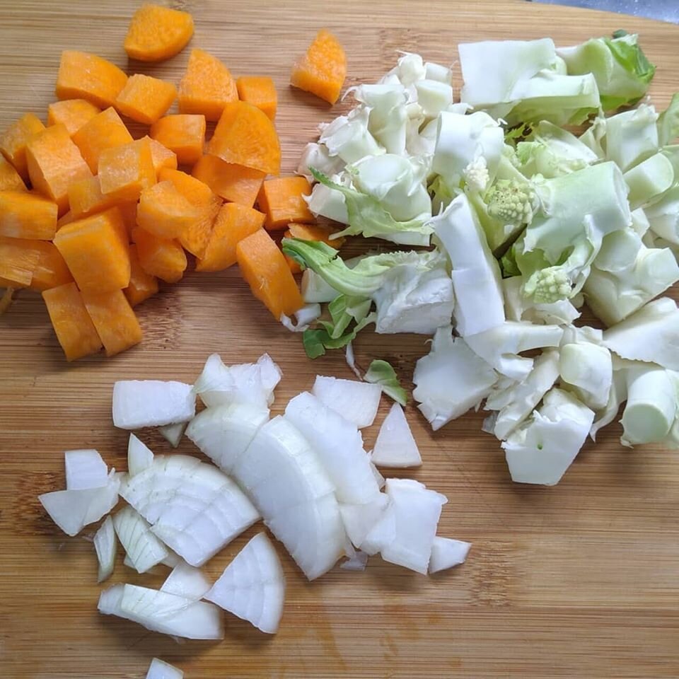 Поставьте на огонь небольшую кастрюльку и вскипятите в ней примерно 2 литра воды. В кипящую воду опустите 2 средних картофелины, пусть варятся до готовности. Солим по вкусу. Лук нарезаем средними ломтиками, морковь кубиками. 1 зубчик чеснока нужно мелко порубить, капусту нарезать на кусочки. В сковороде распускаем столовую ложку оливкового масла и 15г. сливочного.