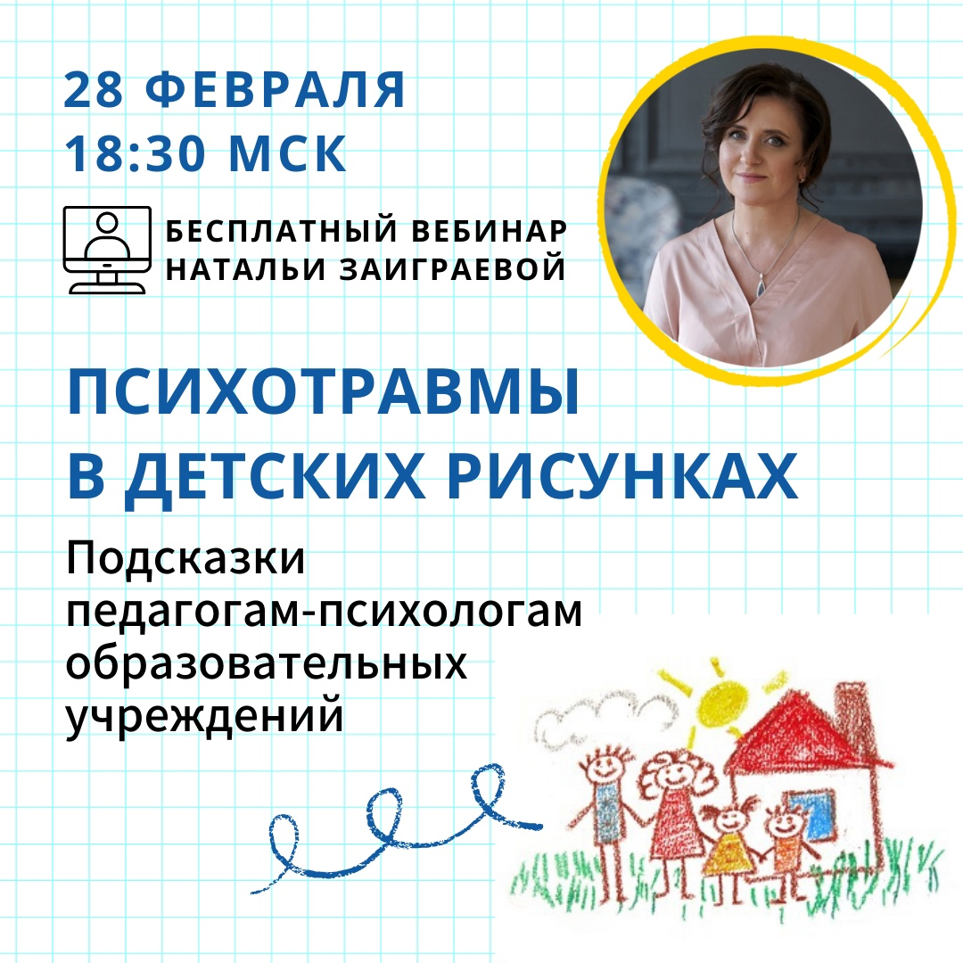 Прекрасный ☀ день! Не находите? Зима сдает свои позиции, весна уже совсем скоро! Ну а в меня для вас приятное сообщение. О своих страхах допустить ошибку в трактовке рисунков 🏞, не заметить что-то очень важное – психотравму, 🆘 угрожающее состояние ребенка и т.п. – или, наоборот, напугать родителей необоснованными опасениями, коллеги часто говорят при встречах. ✳Поэтому я решила поделиться своим опытом на этот счет и провести открытый вебинар "Психотравмы в детских рисунках. Подсказки педагогам-психологам образовательных учреждений" Что вас ждет на вебинаре? 🌀 Что такое «психотравмы» в детском и подростковом восприятии? 🌀 Как обнаружить психотравму в детском и подростковом рисунке? 🌀 Роковые ошибки в работе педагогов-психологов, которые подрывают авторитет специалиста, или как не выдать желаемое за действительное 🌀 Характерные нюансы в рисуночных тестах юных художников, получивших психотравму 🌀 5 практических подсказок, чтобы не перепутать психотравму с возрастным к