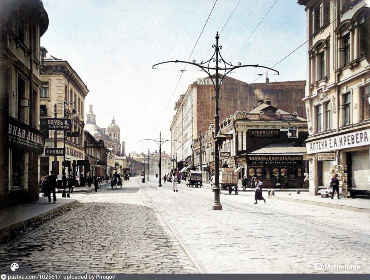 Москва 1890-х – 1910-х годов – самое прекрасное время в истории дореволюционного города. В этот период в Москве начинают строиться красивые доходные дома, прокладываться трамвайные линии, в домах появляются удобства. Город развивается. Давайте отправимся в это время и посмотрим на жизнь Москвы. 1) Покровка 1914 год Покровка была одной из центральных торговых улиц города. На ней селились довольно обеспеченные люди и исторически много иностранцев, ведь Покровка – это прямой путь в Немецкую слободу. К счастью, архитектурный облик улицы почти не изменился за XX век. 2) Каланчевская улица 1914 год Обратите внимание, что почти все тротуары в Москве к 1914 году имели уже асфальтовое покрытие! 3) Никольская улица 1912 год Никольская улица стала одной из первых, где асфальт появился и на проезжей части. 4) Грибной рынок на Москворецкой набережной 1900 год Знаменитые московские рынки! Сколько их было до революции? Не посчитаешь даже... По рассказам Гиляровского нам лучше всего известен Сухар