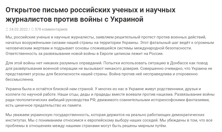 Я бы не затрагивал эту тему, но у меня произошёл диалог с представителем русского научного, так сказать, истеблишмента. Возможно, вы уже сталкивались с «Открытое письмо российских ученых и научных журналистов против войны с Украиной». Так вот, один из учёных поместил ссылку у себя на странице на это письмо с призывом к коллегам присоединиться к этому. Во-первых, хочу исправить безграмотное, фактически неверное название. Это письмо русских учёных, а не российских. Я не имею ввиду национальность. Их объединяет то, что они пишут свои работы на русском языке, поскольку это их родной язык, а не то, что они имеют подданство в РФ. Причина этого обращения там указана чётко: Россия теперь станет страной изгоем «мы, учёные, теперь не сможем нормально заниматься своим делом: ведь проведение научных исследований немыслимо без полноценного сотрудничества с коллегами из других стран». В ходе дискуссии я получил ответ по поводу Украины: это суверенное государство и что там происходит нас не касается,
