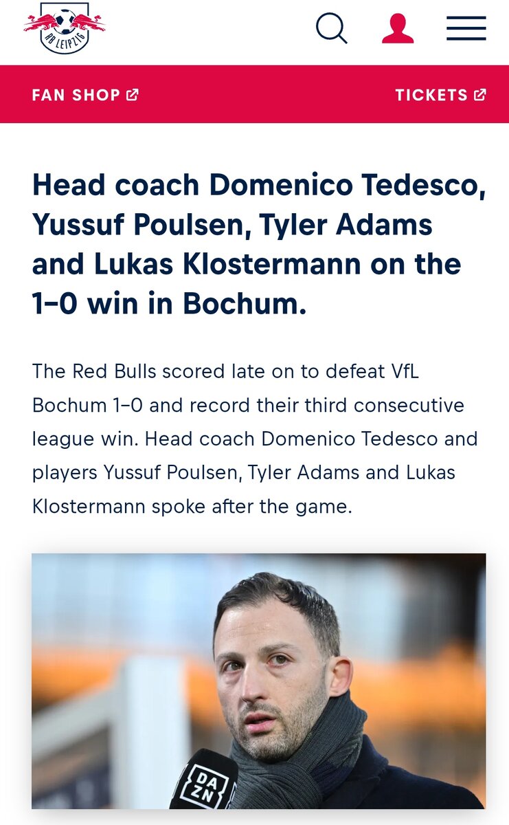 Главный тренер Доменико Тедеско о победе в Бохуме со счетом 1:0. «Ред Буллз» забили поздно, чтобы победить «Бохум» со счётом 1: 0 и зафиксировать свою третью подряд победу в лиге. «Мы очень довольны тремя очками. Вы могли понять, почему здесь выигрывают лишь несколько команд. Они многого требуют от вас. На них трудно оказать давление. цель мужчин и за линией защиты. Во-первых, мы очень хорошо защищались и выиграли много поединков. Одиннадцать игроков вступили в бой и приложили немало усилий, что позволило нам проложить путь. Во втором тайме «Бохум» был немного ближе к тому, чтобы выйти вперёд, чем мы, так что победа — это немного удача» - Доменико Тедеско. Источник: https://rbleipzig.com/en/news/2021-2022/bocrbl-reaction/