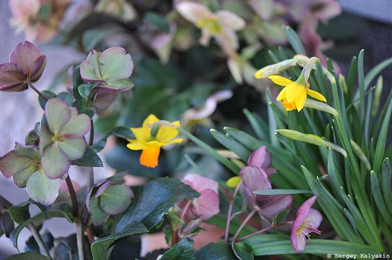 Цветут морозники, иридодиктиумы и крокусы, распустились первые гиацинты, а подснежники уже отцветают. Каждую весну я покупаю выгоночные нарциссы, в этом году они стоят на крыльце вместе с морозниками. Но и те нарциссы, которые я уже пересадил в сад, начали цвести. Не все, конечно - махровые всё ещё стоят в бутонах, но, думаю, на следующей неделе распустятся. Цветут крокусы: темно-фиолетовый Flower Record, штрихованный King of Stripes, белый Jeanne d'Arc, бело-чернильные Prins Claus и Ladykiller, голубой Blue Pearl, бледно-желтый Romantica, ярко-фиолетовый Ruby Giant и бледно-фиолетовый в белой обертке Vanguard. Зацвели гиацинты. Не очень эффектно, но для луковиц, которые я никогда не выкапываю, вполне прилично. Фиолетовые полянки анемоны нежной с каждым днем цветут всё обильнее. Из иридодиктиумов остались только Lady Beatrix Stanley и Harmony, совсем немножко. Подозреваю, что виной тому прошлогоднее сырое лето. Подснежники уже отцветают и начинают ложиться на землю под тяжестью завязей