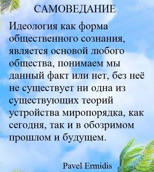 Идеология как форма общественного сознания, является основой любого общества, понимаем мы данный факт или нет, без неё не существует ни одна из существующих теорий устройства миропорядка, как сегодня, так и в обозримом прошлом и будущем. Другой вопрос, что идеология может быть ярко выраженной, консервативной или радикальной, которая присутствует в нашей жизни, начиная с самого раннего детства, представляя одностороннее мнение, основанное на твёрдом убеждении в правоте взглядов и жизненных устоев. Идеология прежде всего выражает интересы властных элит, формирует массовое сознание, создаёт сетевые структуры для управления обществом и более-менее устойчивым образом взаимоотношений живущих в нём людей. Конечно, мы вправе принять или отвергнуть идеологию, но мы не можем существовать вне её, переходя от одной крайности к другой, считая, что изменения приведут к более востребованному образу жизни под влиянием замены мышления на противоположное мнение, которое было идеалом ещё вчера. Идеология
