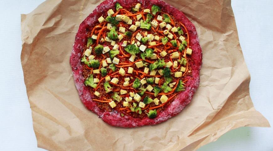 Что нужно: 1. Дрожжи сухие 1 ч.л. 2. Вода 60 мл 3. Мука пшеничная цельнозерновая 125 г 4. Масло оливковое 3 ст.л. 5. Соль 0,5 ч.л. 6. Сахар 1 ч.л. 7. Свекла 1 шт. 8. Чеснок 2 зубчика шт. 9. Горчица зернистая 4 ст.л. 10. Морковь по-корейски 60 г 11. Тофу 60 г 12. Брокколи 10-12 соцветий шт. 13. Перец черный молотый по вкусу Как готовить: 1. Для теста соедините воду, дрожжи, сахар и 1 ст.л. муки от общей массы, перемешайте до объединения, поставьте в теплое место на 10-15 минут. 2. Пока опара созревает, очистите свеклу и чеснок, натрите на мелкой терке. Подошедшую опару перемешайте, введите масло и соль, перемешайте. Добавьте свеклу и чеснок, затем введите муку в 2-3 приема, замесите тесто. Поставьте в теплое место на 1 час (должно увеличится в 2 раза) 3. Тесто раскатайте в 2 круга толщиной 8-10 мм, смажьте каждую заготовку горчицей, положите корейскую морковь, нарезанный кубиками тофу, разобранную на мелкие соцветия брокколи, посыпьте свежемолотым черным перцем. 4. Вы