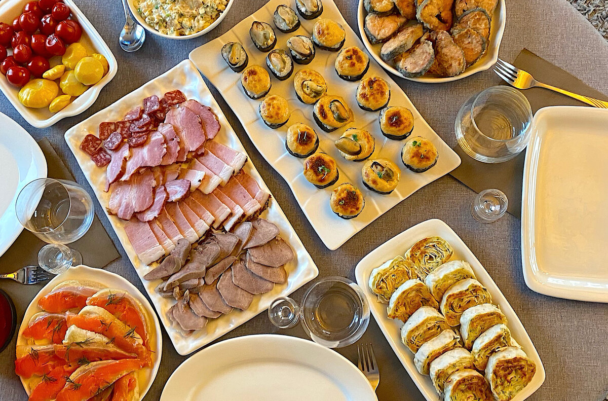 Здравствуйте, дорогие читатели! Накрыть стол в праздник не удалось, мы с мужем работали и времени на посиделки не было, мы просто перенесли это вкусное дело на выходной день. Еще к нам в гости приехала моя сестренка, так что повод был двойной - отметили 23 февраля и приезд родного человека. Готовить много не стала, нас было всего три человека, но все равно хотелось накрыть стол чтобы было вкусно и сытно. Какие-то блюда вы уже неоднократно встречали на моем канале, но есть пара новых рецептов о которых я расскажу в данной статье. Роллы с мидиями в запеченном виде готовлю не очень часто, хоть и очень любим такую еду. Кому-то покажется, что они неуместны на данном столе, но, как показывает практика, роллы пользуются большим спросом, а это значит, что они совсем не лишние. Подаю их с соевым соусом и васаби, как закуска очень даже. Может и вам пригодится рецепт. Подробно можно посмотреть в этой статье. СОСТАВ: Мидии копченые - 20-25 шт. Творожный сыр - 180-200 г Авокадо - 1/2 шт. Листья но