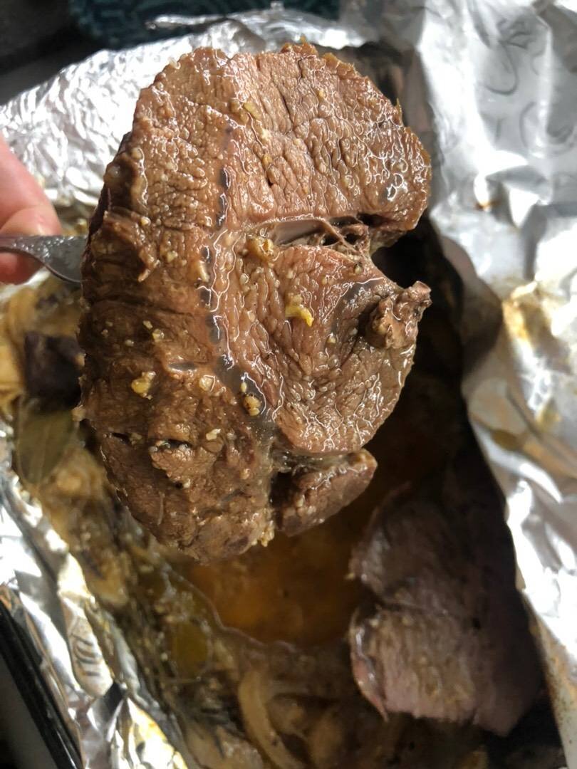 Ингредиенты: Говядина, Розмарин, Лук, Приправы , Соль Способ приготовления: Подготовить мясо, помыть, очистить от шкурок и жилок! Далее блюдо для запекания застилаем фольгой. Нарезаем лук крупными кольцами и укладываем на дно формы. Добавляем лаврушка, чеснок и специи по вкусу. Кусок мяса солим и при желании приправляем специями. До этого пробовала смазывать зерновой горчицей тоже было вкусно ). Кладём пару веточек розмарина и запечатываем сверху тремя слоями фольги. Отправляем в духовку при 180 градусах на 2 часа.