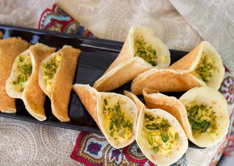 Блины популярны не только в нашей стране, но и по всему миру, и у каждого народа существует свой рецепт. Например, в Сирии, Египте и Ливане готовят склеенные по краям хрустящие блины с начинками. Их можно склеивать с одной стороны (как на фото), а можно в виде вареников или же треугольников (как эчпочмак). Начинку можно выбрать любую, но мы предлагаем вам рассмотреть вариант с сыром и грибами. Для приготовления катаеф вам понадобятся: Подготавливаем дрожжи В тёплую воду объёмом 125мл насыпаем дрожжи и две чайные ложки сахара. Оставляем смесь на 10 минут: ждём, пока дрожжи вспенятся. Пока ждём, можно подготовить начинку. Мелко нарезаем лук и грибы, а затем обжариваем на сковородке. Солим и перчим по вкусу. Сыр натираем на тёрке в отдельную тарелку. Готовим тесто В поднявшиеся дрожжи добавляем чайную ложку соли и разрыхлитель. Далее к смеси добавляем тёплое молоко, а затем просеянную муку. Прежде чем приступить к выпеканию блинов, нужно дать тесту постоять примерно минут 20. Жарим блины