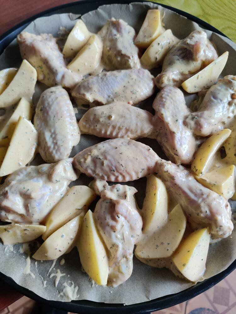 Нашла рецепт на просторах интернета. Попробовала. Это вкусно/просто, а значит, он стоит того, чтобы его записать и периодически использовать)) Ингредиенты: куриных крылышек, небольших картофелины, майонеза/нежирной сметаны, соль/специи Способ приготовления: Нарезать крылья на части, картофель на дольки. Соединить крылья, картофель, соль, специи, майонез. Оставить мариноваться на полчаса. Выложить крылышки и картофель на лист в один слой. Удобней использовать пергамент)) Запекать 40 минут при 180°.
